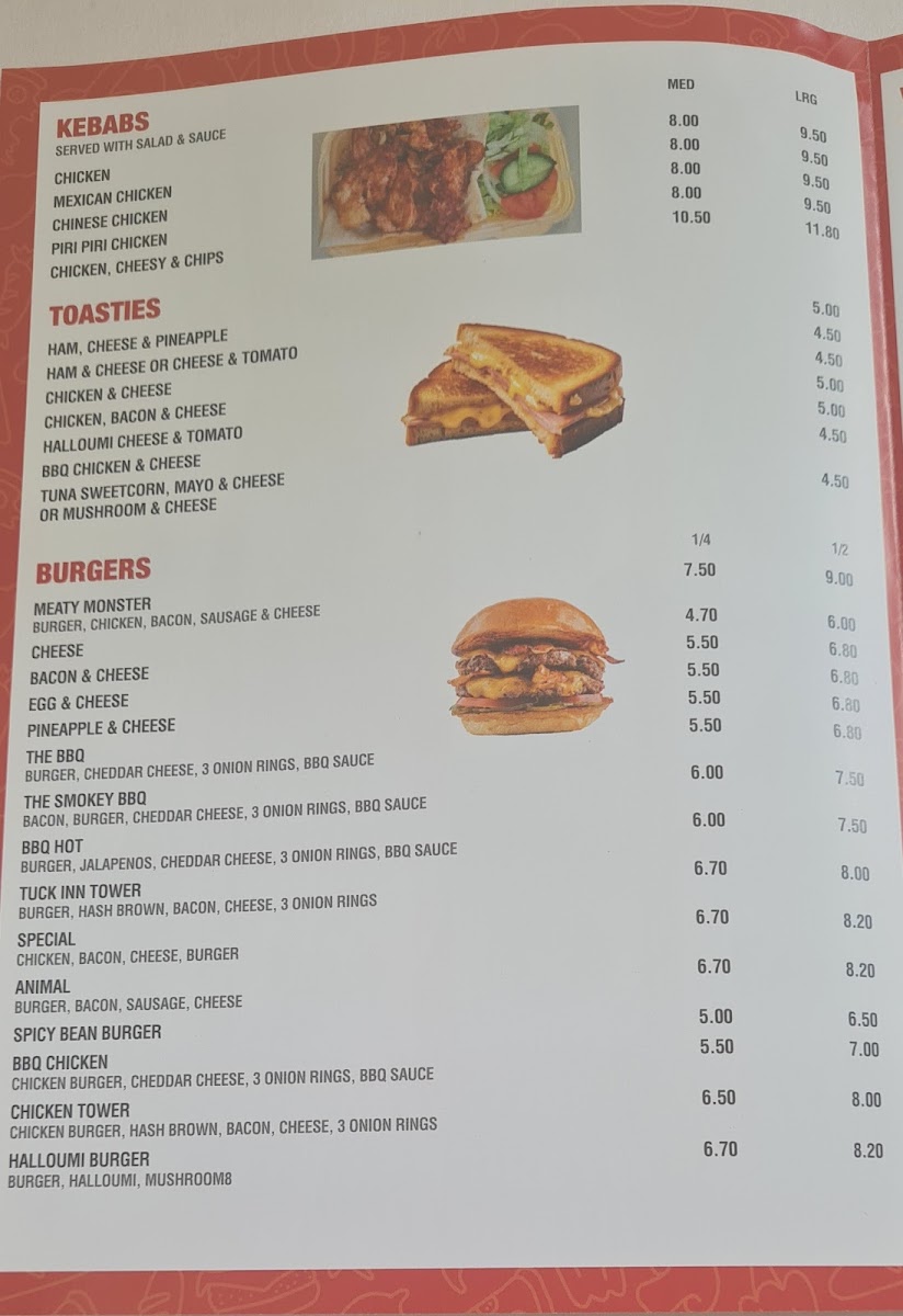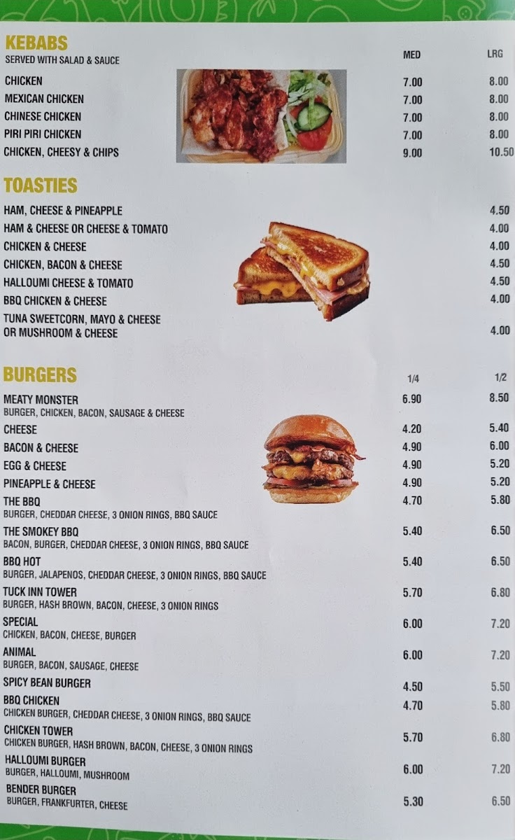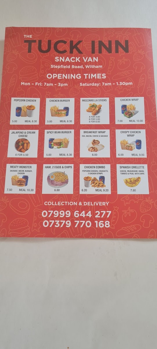 Welcome to The Tuck Inn, a delightful café located at 2 Stepfield in Witham. This hidden gem offers an enticing menu tailored for food lovers. The kebab selection is a highlight, featuring options like Mexican Chicken and Piri Piri Chicken, each priced reasonably at just £7.00. Don’t miss their flavorful omelettes, with choices ranging from Spanish to Chicken, Bacon & Cheese, sure to satisfy your breakfast cravings.